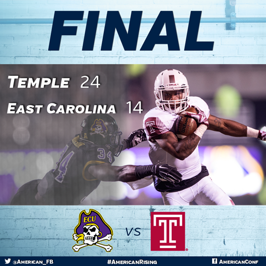 GREENVILLE, N.C. -- P.J. Walker threw a late 23-yard touchdown pass to Robby Anderson, and No. 22 Temple rallied to beat East Carolina 24-14 on Thursday night.
