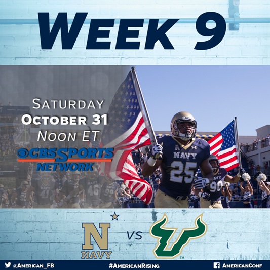USF improved to 4-3 with a 38-14 win against SMU, giving the Bulls their first three-game winning streak since the 2011 season USF has matched its four victories from last year … RB Marlon Mack, who was The American’s Rookie of the Year in 2014, did not play against SMU last week, but is expected to return Saturday against Navy … Mack is second in The American in rushing at 114.8 yards per game and has registered three straight 100-yard efforts … QB Quinton Flowers has started all seven games and has completed 86 of 142 passes (60.6 percent) for 1,038 yards and 10 touchdowns with six interceptions … Flowers also has rushed for 563 yards and seven TDs after he set The American’s single-game record for a quarterback with 201 yards against SMU … WR Rodney Adams has 17 receptions for 247 yards and five touchdowns … The Bulls rank ninth nationally in tackles for loss, averaging 8.1 per game … S Jamie Byrd has 53 tackles with four sacks, eight tackles for loss, two interceptions and two forced fumbles and is the team leader in all five categories.
