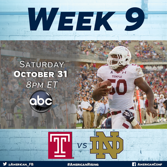 Temple is 7-0 for the first time in program history after the Owls rallied for a 24-14 road win against East Carolina last Thursday … Temple returned to the top 25 last week for the first time since 1979 … The win against East Carolina was Temple’s first victory as a ranked team since 1941 … In their last four games, the Owls scored the final 14 points against East Carolina, the last 16 points against UCF, the last 42 against Tulane and the last 27 against Charlotte … Temple has outscored its seven opponents in the second half by a 137-29 margin … The Owls has been led offensively by RB Jahad Thomas, who is fourth in the nation in all-purpose yards (175.0 ypg) and has rushed for 822 yards and 12 touchdowns on 165 carries … QB P.J. Walker has completed 113 of 189 passes (59.8 percent) for 1,314 yards and nine touchdowns … WR Robby Anderson has a team-high 31 catches for 388 yards and five touchdowns … The defense is led by LB Tyler Matakevich, the Butkus Award candidate who has 65 tackles, 4.0 sacks, 7.0 tackles for loss, four interceptions and four pass breakups and is the NCAA’s active career leader in total tackles (419) … Temple’s special teams unit has blocked five kicks this season.