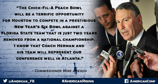 “I would like to congratulate the student-athletes, coaches and administrators at Houston for achieving yet another milestone this season,” said commissioner Mike Aresco. “The Chick-Fil-A Peach Bowl will be a terrific opportunity for Houston to compete in a prestigious New Year’s Six Bowl against a Florida State team that is just two years removed from a national championship. I know that Coach Herman and his team will represent our conference well in Atlanta.”