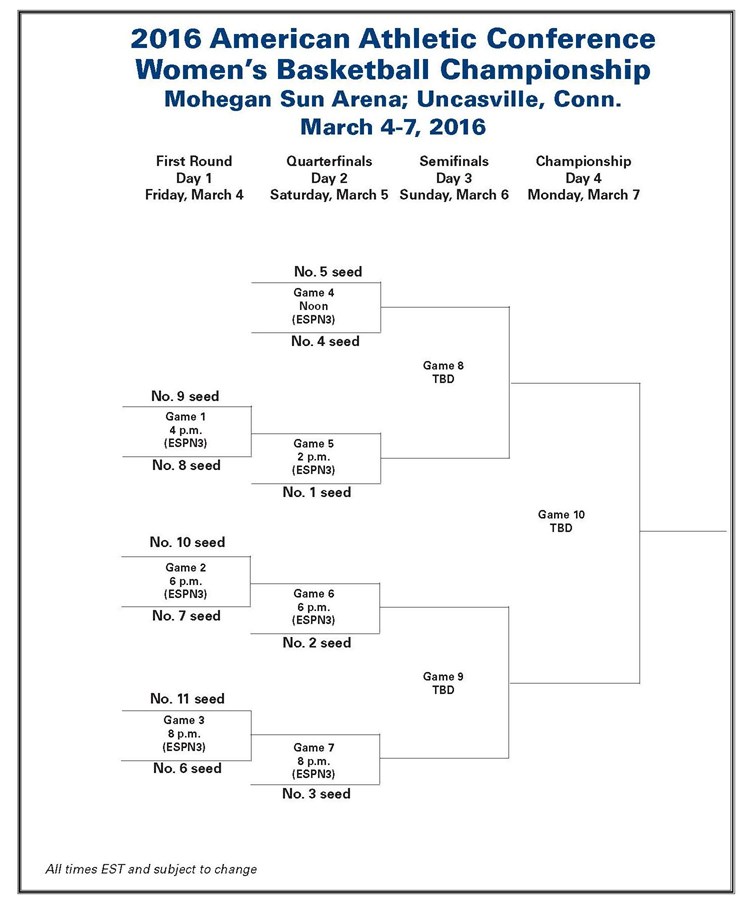 The 2016 American Women's Basketball Championship will be played March 4-7 at Mohegan Sun Arena in Uncasville, Conn. All 10 tournament games will be telecast on the ESPN family of networks.