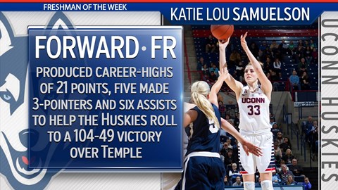 Samuelson averaged 16.0 points, 5.5 assists and shot 63.2-percent from the field in a 2-0 week for the top-ranked Huskies. The freshman began the week with 11 points and five assists in an 86-46 win over Memphis on Wednesday. Samuelson went 4-of-7 from the field and produced two steals against the Tigers. The Huntington Beach, Calif., native highlighted the week with a 21-point, six-assist performance in a win against Temple on Saturday. Samuelson shot 66.7-percent from the floor and registered five 3-pointers in her second start of the season.