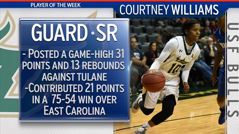 Williams powered USF to a 2-0 week in league play behind 26 points per game, 12 rebounds and three assists. The senior shot 43.5-percent from the field (20-of-46) and connected on 7-of-15 attempts from long range in the two games. Williams poured in 31 points on 12-of-23 shooting and grabbed a game-high 13 rebounds in a 71-67 road win against Tulane. The forward scored 17 of her 31 points in the final quarter to lead the Bulls past the Green Wave. The product of Folkston, Ga., finished the week with a 21-point, 11-rebound performance against East Carolina on Sunday.