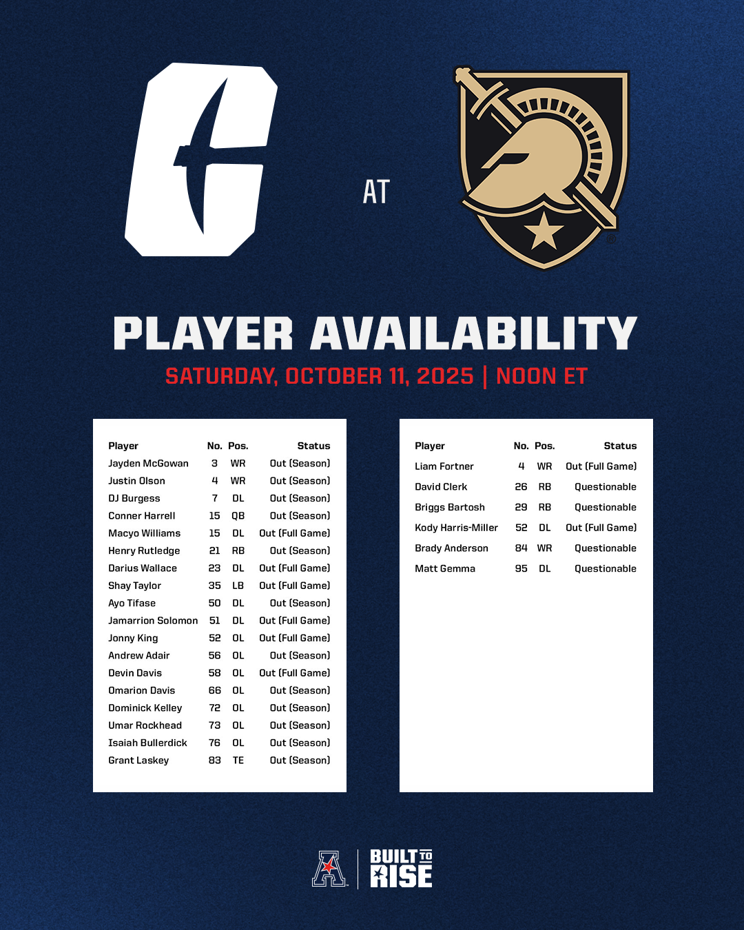 Player Availability Report - Charlotte at Army (Oct. 11, 2025) Player availability report for the Charlotte at Army football game scheduled for Saturday, October 11, 2025, at Michie Stadium.