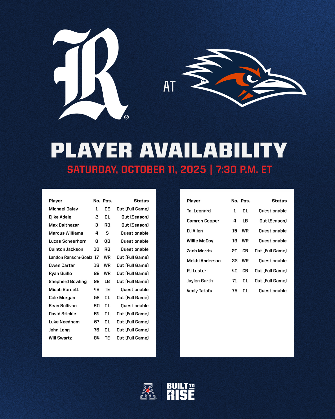 Player Availability Report - Rice at UTSA (Oct. 11, 2025) Player availability report for the Rice at UTSA football game scheduled for Saturday, October 11, 2025, at the Alamodome.
