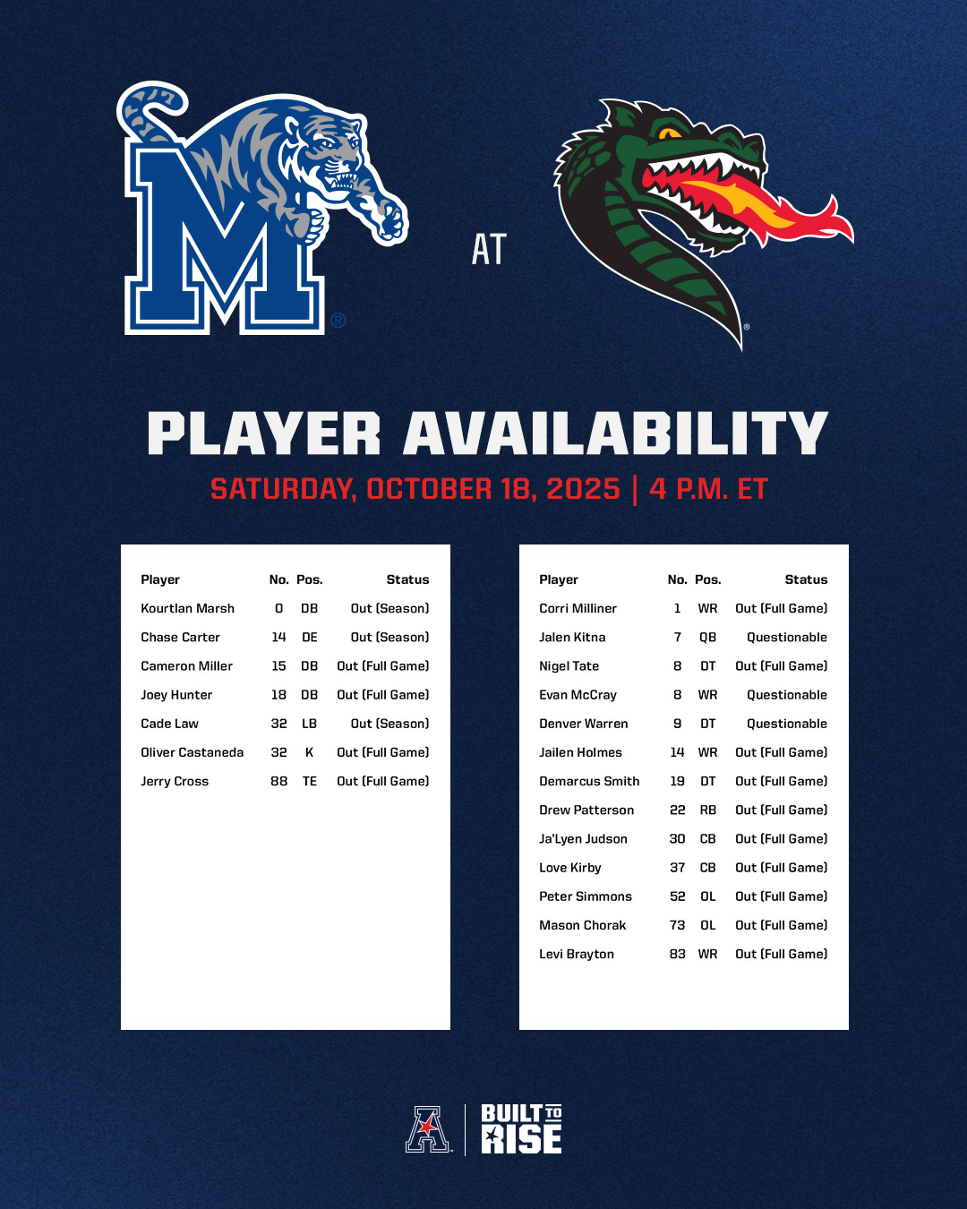 Player Availability Report - Memphis at UAB (Oct. 18, 2025) Player availability report for the Memphis at UAB football game scheduled for Saturday, October 18, 2025, at Protective Stadium.