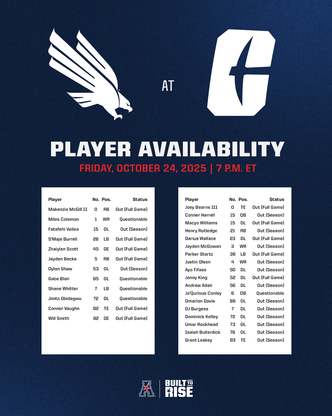 Player Availability Report - North Texas at Charlotte (Oct. 24, 2025) Player availability report for the North Texas at Charlotte football game scheduled for Friday, October 24, 2025, at Jerry Richardson Stadium.