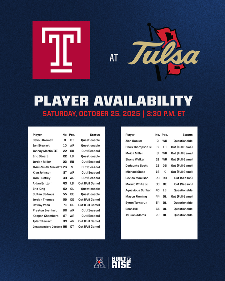 Player Availability Report - Temple at Tulsa (Oct. 25, 2025) Player availability report for the Temple at Tulsa football game scheduled for Saturday, Oct. 25, at H.A Chapman Stadium.