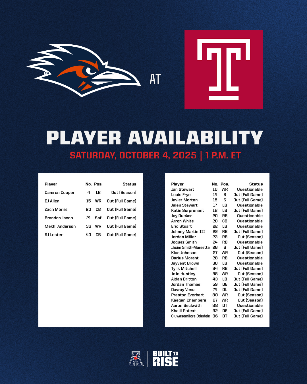 Player Availability Report - UTSA at Temple (Oct. 4, 2025) Player availability report for the UTSA at Temple football game scheduled for Saturday, October 4, 2025, at Lincoln Financial Field.
