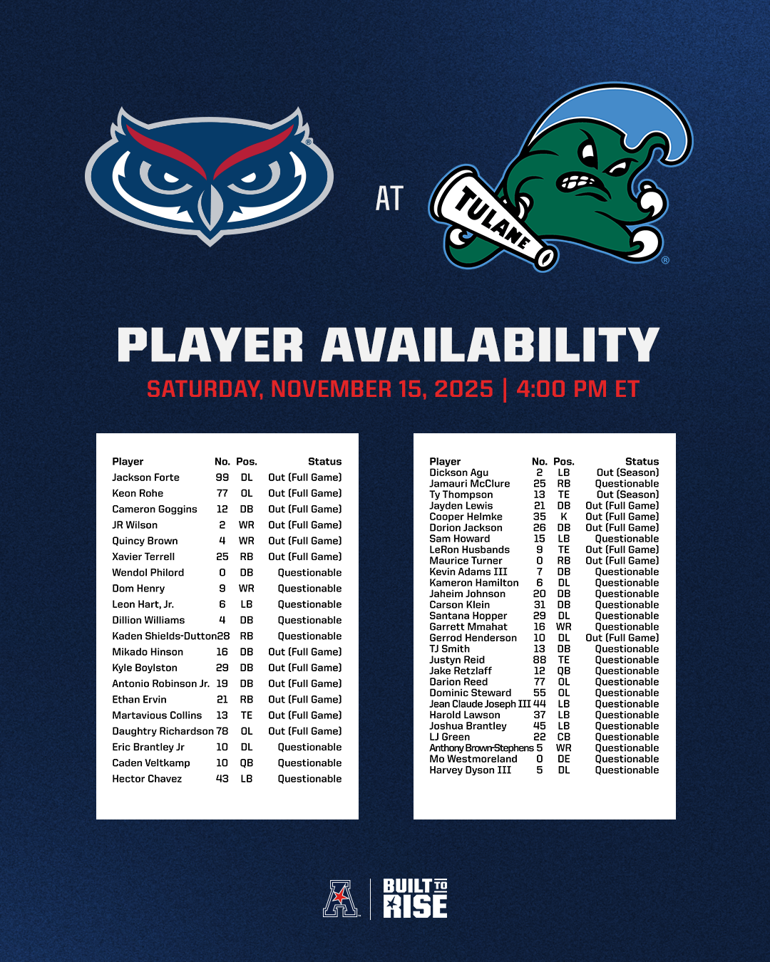 Player Availability Report - Florida Atlantic at Tulane (Nov. 15, 2025) Player availability report for the Florida Atlantic at Tulane football game scheduled for Saturday, November 15, 2025, at Yulman Stadium.