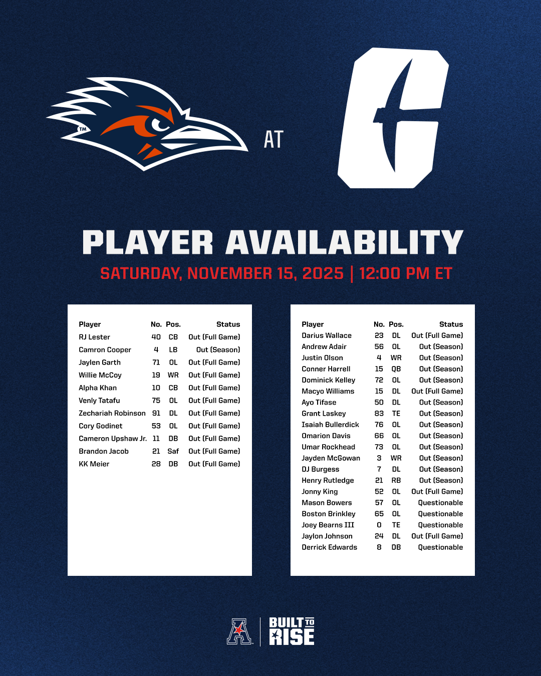 Player Availability Report - UTSA at Charlotte (Nov. 15, 2025) Player availability report for the UTSA at Charlotte football game scheduled for Saturday, November 15, 2025, at Jerry Richardson Stadium.
