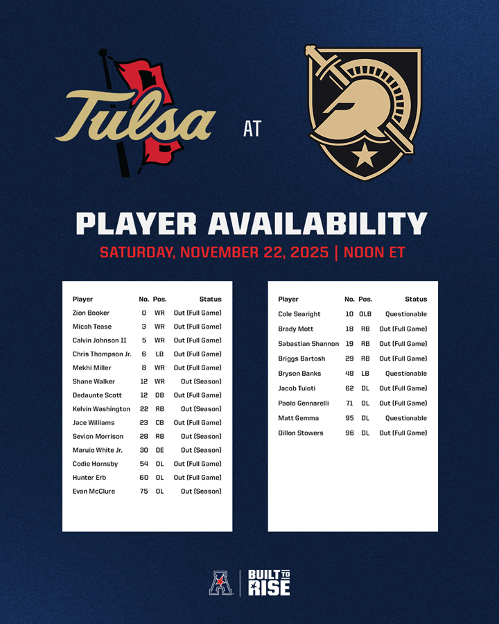 Player Availability Report - Tulsa at Army (Nov. 22, 2025) Player availability report for the Tulsa at Army football game scheduled for Saturday, November 22, 2025, at Michie Stadium.