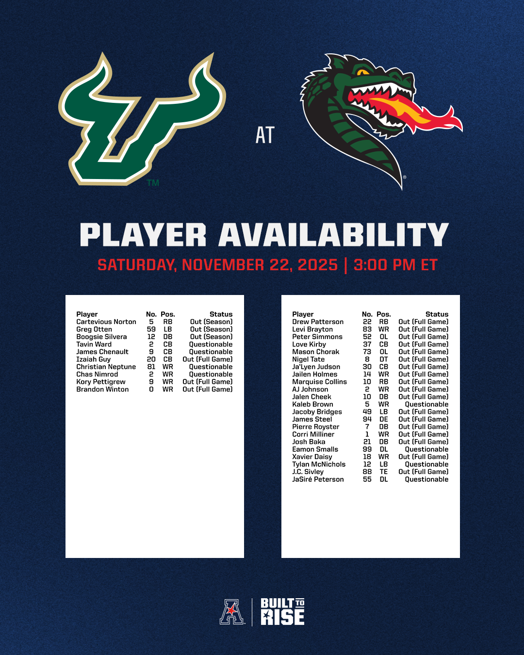 Player Availability Report -South Florida at UAB (Nov. 22, 2025) Player availability report for the South Florida at UAB football game scheduled for Saturday, November 22, 2025, at Protective Stadium.
