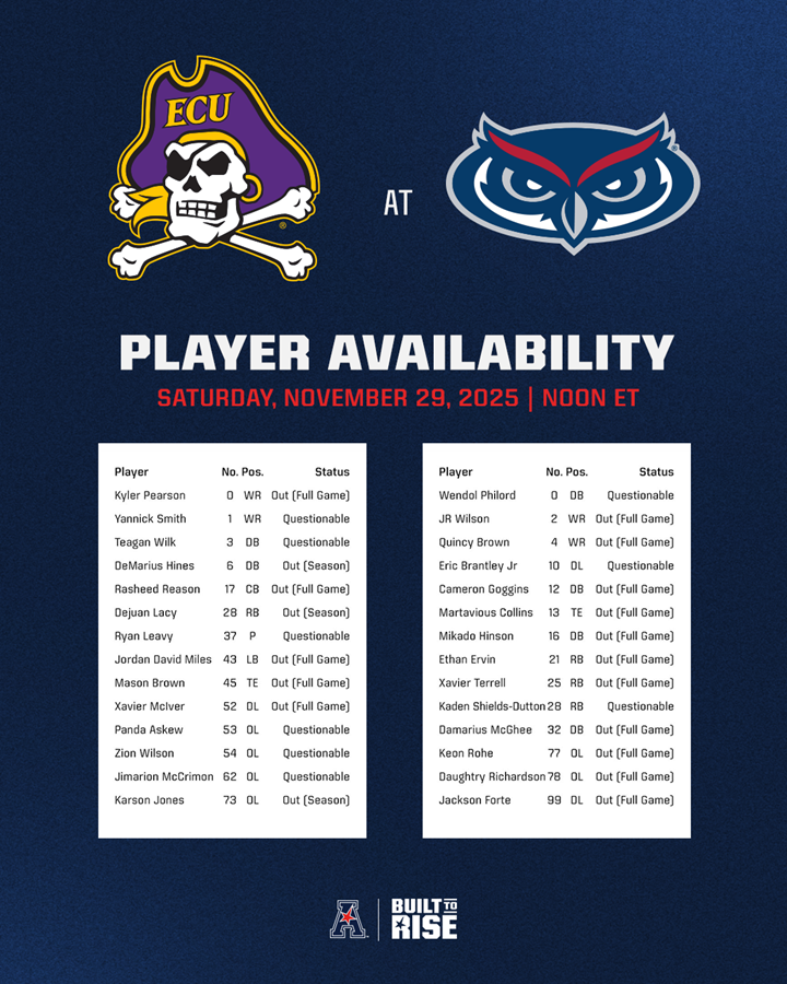 Player Availability Report - East Carolina at Florida Atlantic (Nov. 29, 2025) Player availability report for the East Carolina at Florida Atlantic football game scheduled for Saturday, November 29, 2025, at Flagler Credit Union Stadium.