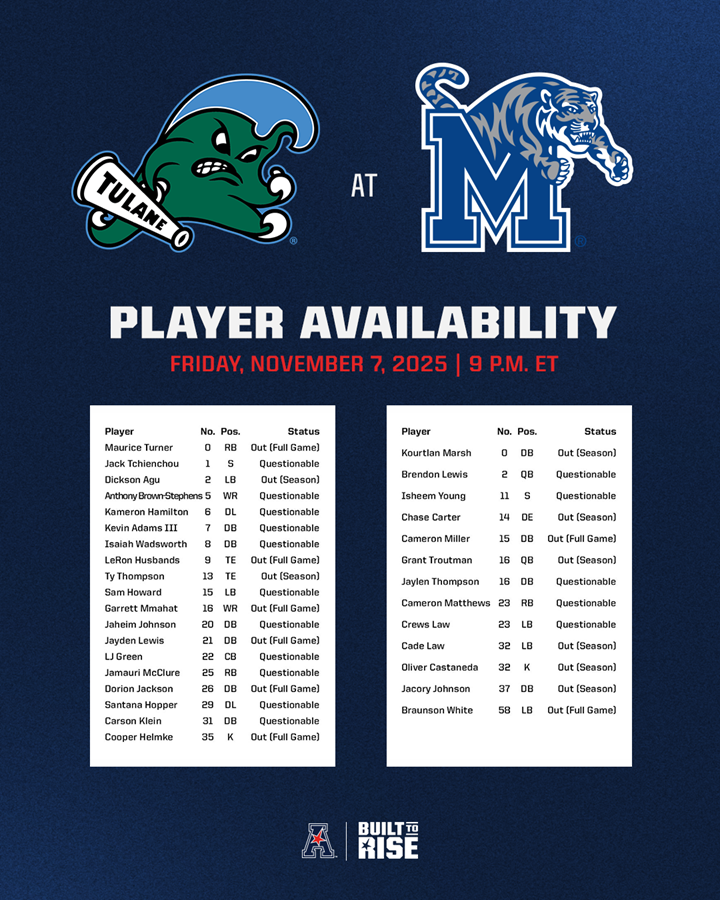 Player Availability Report - Tulane at Memphis (Nov. 7, 2025) Player availability report for the Tulane at Memphis football game scheduled for Friday, November 7, 2025, at Simmons Bank Liberty Stadium.