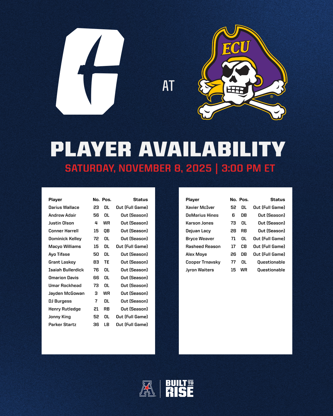 Player Availability Report - Charlotte at East Carolina (Nov. 8, 2025) Player availability report for the Charlotte at East Carolina football game scheduled for Saturday, November 8, 2025, at Dowdy-Ficklen Stadium..
