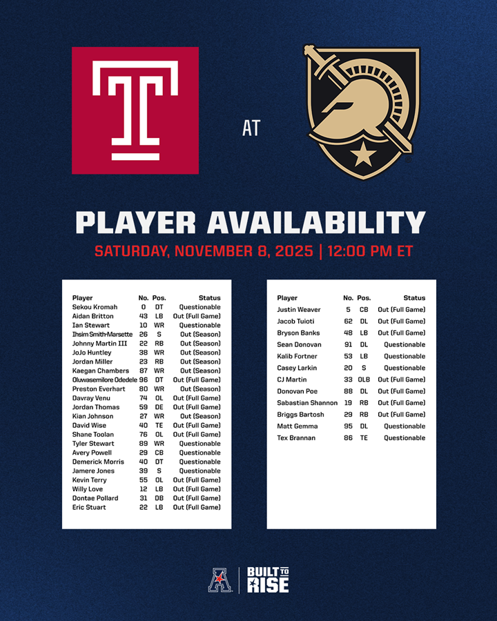Player Availability Report - Temple at Army (Nov. 8, 2025) Player availability report for the Temple at Army football game scheduled for Saturday, November 8, 2025, at Michie Stadium.