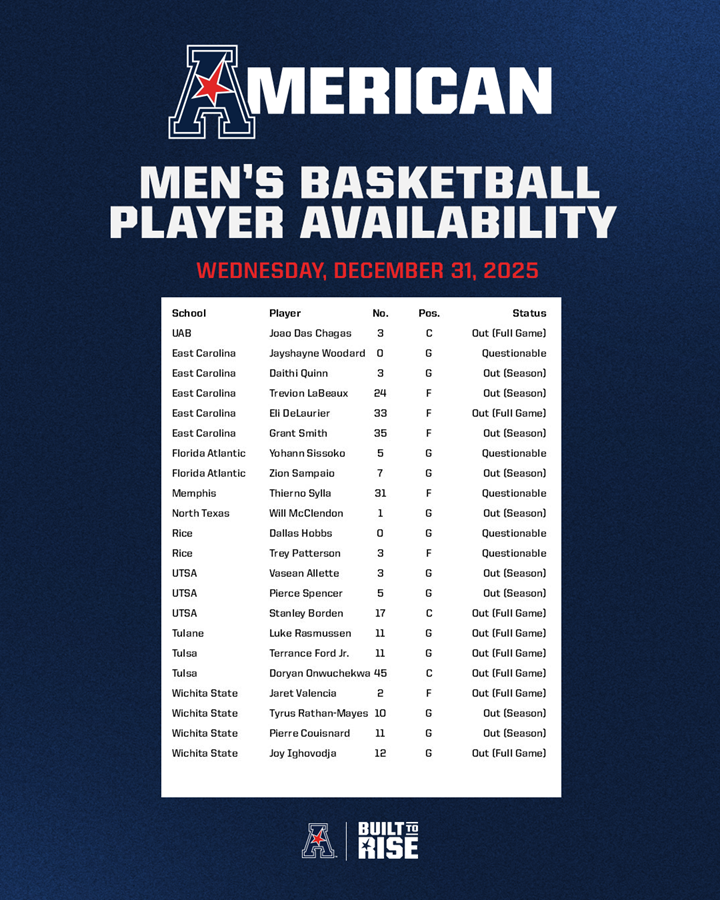Men's Basketball Player Availability Report - (December 31, 2025) Player availability report for American men's basketball games scheduled for Wednesday, December 31, 2025.