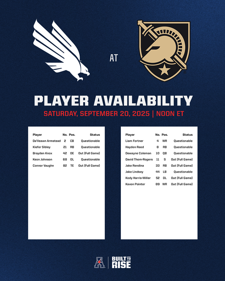 Player Availability Report - North Texas at Army (Sept. 20, 2025) Player availability report for the North Texas at Army football game scheduled for Saturday, Sept. 20, at Michie Stadium.