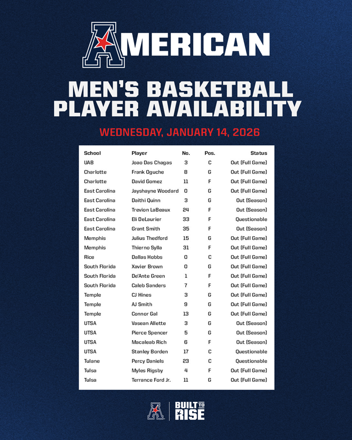 Men's Basketball Player Availability Report - (January 14, 2026) Player availability report for American men's basketball games scheduled for Wednesday, January 14, 2026.