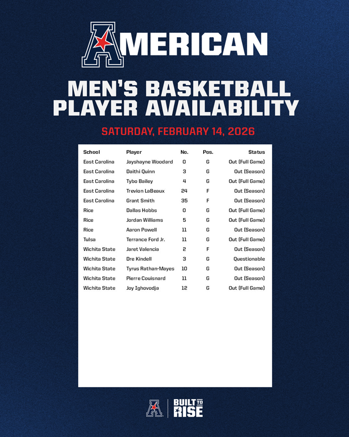 Men's Basketball Player Availability Report - (February 14, 2026) Player availability report for American men's basketball games scheduled for Saturday, February 14, 2026.