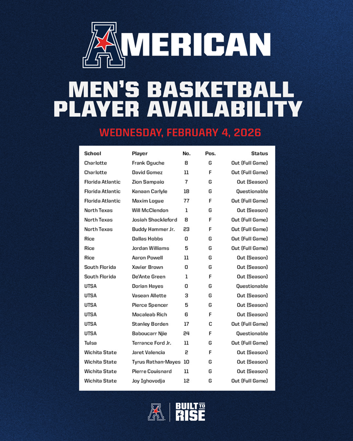 Men's Basketball Player Availability Report - (February 4, 2026) Player availability report for American men's basketball games scheduled for Wednesday, February 4, 2026.