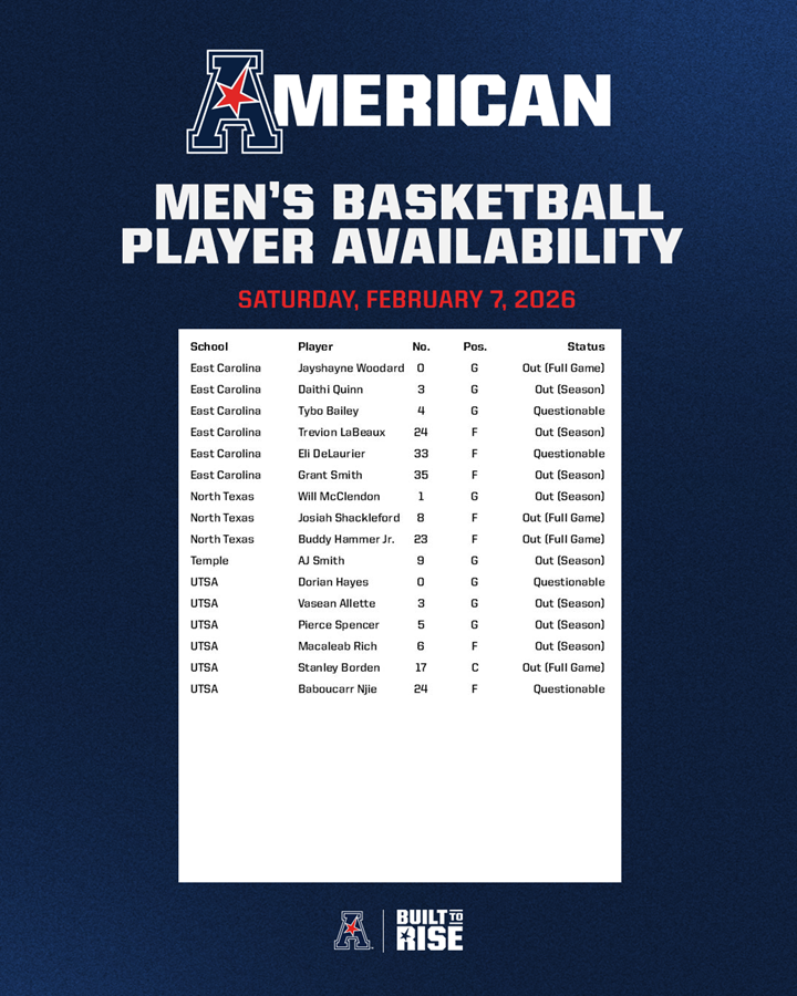 Men's Basketball Player Availability Report - (February 7, 2026) Player availability report for American men's basketball games scheduled for Saturday, February 7, 2026.