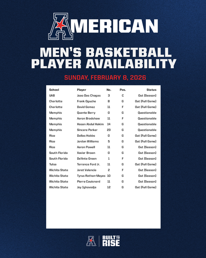 Men's Basketball Player Availability Report - (February 8, 2026) Player availability report for American men's basketball games scheduled for Sunday, February 8, 2026.