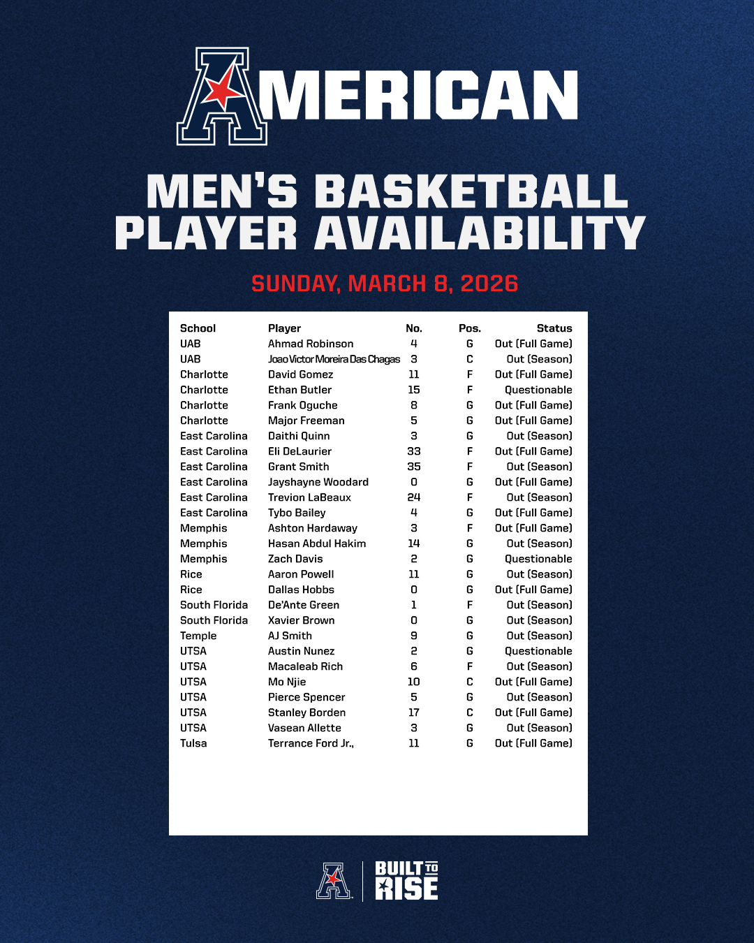 Men's Basketball Player Availability Report - (March 8, 2026) Player availability report for American men's basketball games scheduled for Sunday, March 8, 2026.